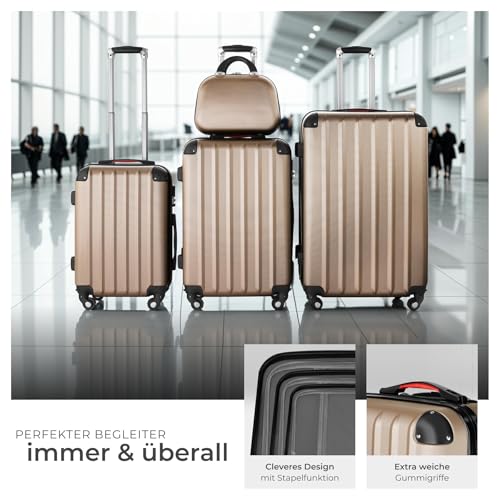 Der tectake 4-teilige Reisekoffer ist perfekt für alle, die im Urlaub oder auf Geschäftsreisen stilvoll und organisiert reisen möchten. Mit einem eleganten Design in Champagner und einer robusten Hartschale bietet dieses Kofferset aus einem großen Koffer und mehreren kleineren Optionen alles, was du für deine Abenteuer benötigst.